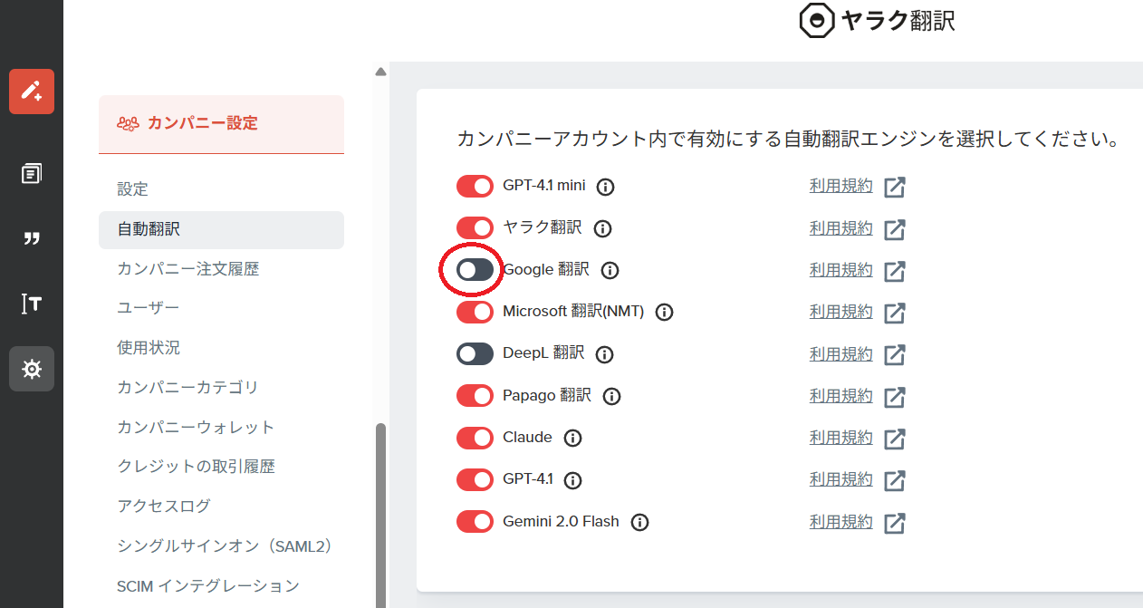 カンパニー管理者は、カンパニー設定>自動翻訳ページにて、カンパニー内のユーザー全員に対して各エンジンの表示