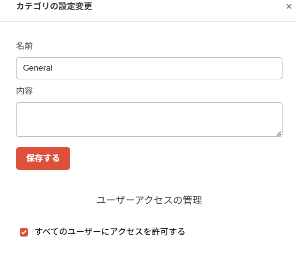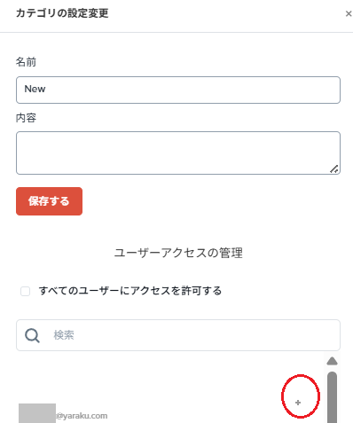 カテゴリへのアクセス権を付与する方法を知りたいです。 二つの方法あります。1.全てのユーザーにアクセス権を付与する場合、「すべてのユーザーにアクセスを許可する」のチェックボックスにチェックを入れてください。2.アクセス権を個別に付与する場合、「+」アイコンからお一人ずつ追加してください。