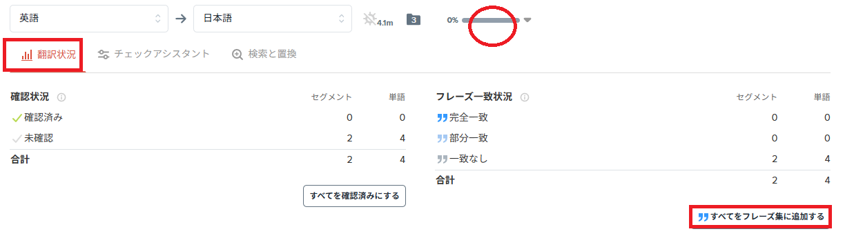 編集した全体ドキュメントの翻訳文を一括で登録したい場合、翻訳状況のタブを開いて、「すべてをフレーズ集に追加する」ボタンをクリックしてください。