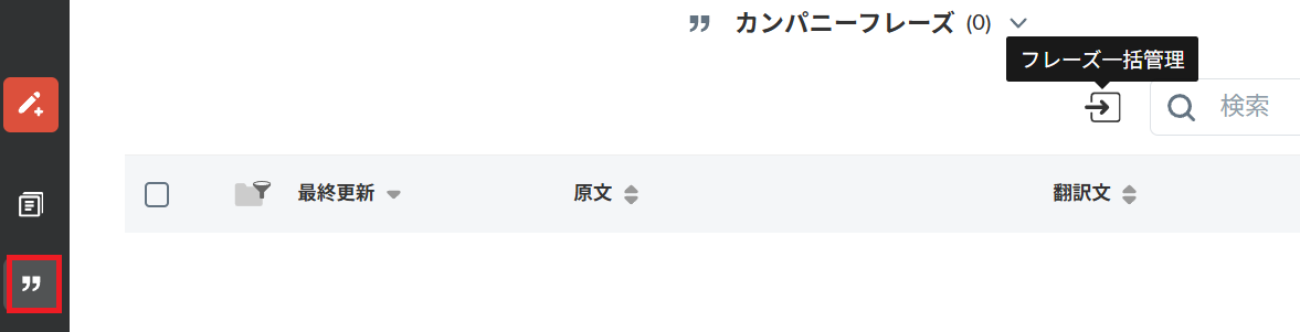 ・カンパニーフレーズ集ページの「フレーズ一括管理」アイコンをクリックし、カテゴリを選んでファイル(CSVまたはTMX形式)をインポート。